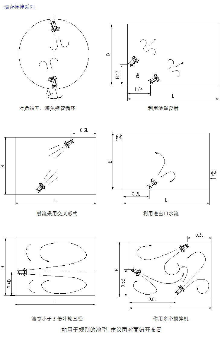潛水?dāng)嚢铏C(jī)的選型是一項(xiàng)比較復(fù)雜的工作,選型的正確與否直接影響設(shè)備的正常使用,作為選型的原則就是要讓攪拌機(jī)在適合的容積里發(fā)揮充分的攪拌功能,一般可用流速來確定。根據(jù)污水處理廠不同的工藝要求,攪拌機(jī)流速應(yīng)保證在0.15~0.3m/s之間,如果低于0.15m/s的流速則達(dá)不到推流攪拌效果,超過0.3m/s的流速則會(huì)影響工藝效果且造成浪費(fèi)。所以在選型前首先確定潛水?dāng)嚢铏C(jī)運(yùn)用的場所,如:污水池、污泥池、生化池;其次是介質(zhì)的參數(shù),如:懸浮物含量、粘度、溫度、PH值;還有水池的形狀、水深等。